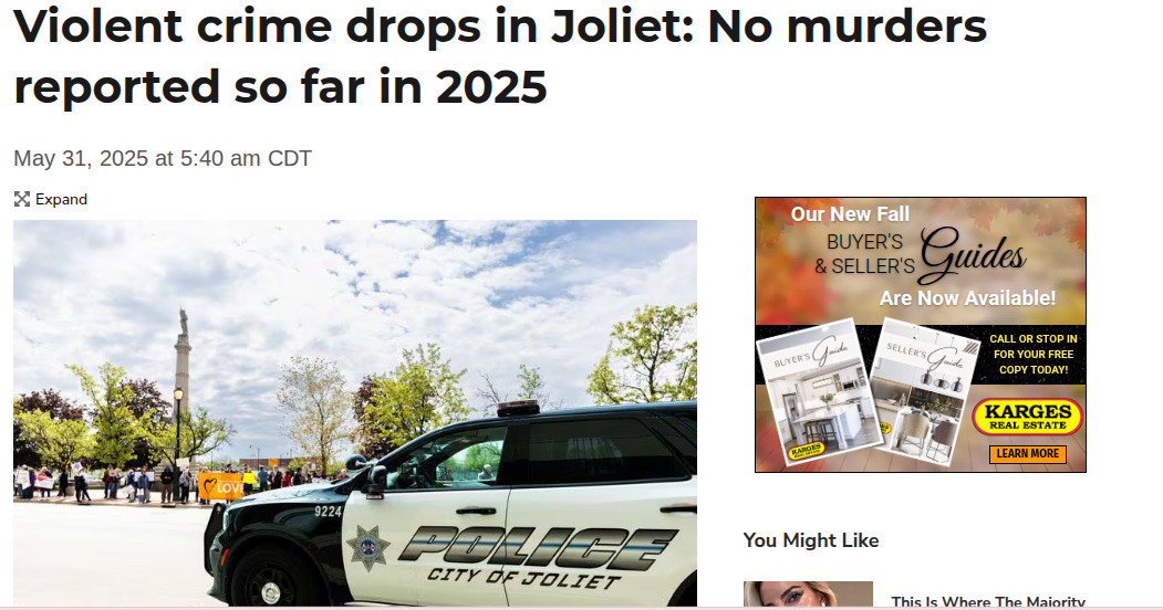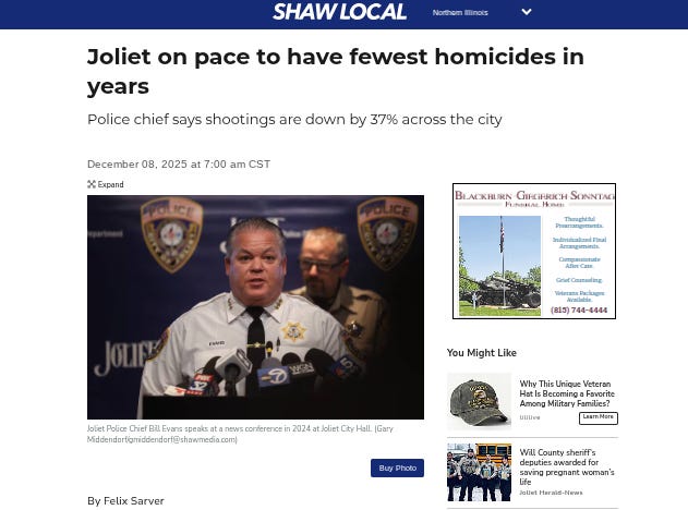 On December 7th, 2025, Joliet Police Chief Bill Evans proudly informs the city council that Joliet has experienced a record-low 2 homicides this year and an astonishing 90% clearance rate in homicide investigations.