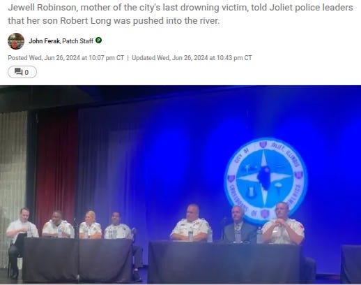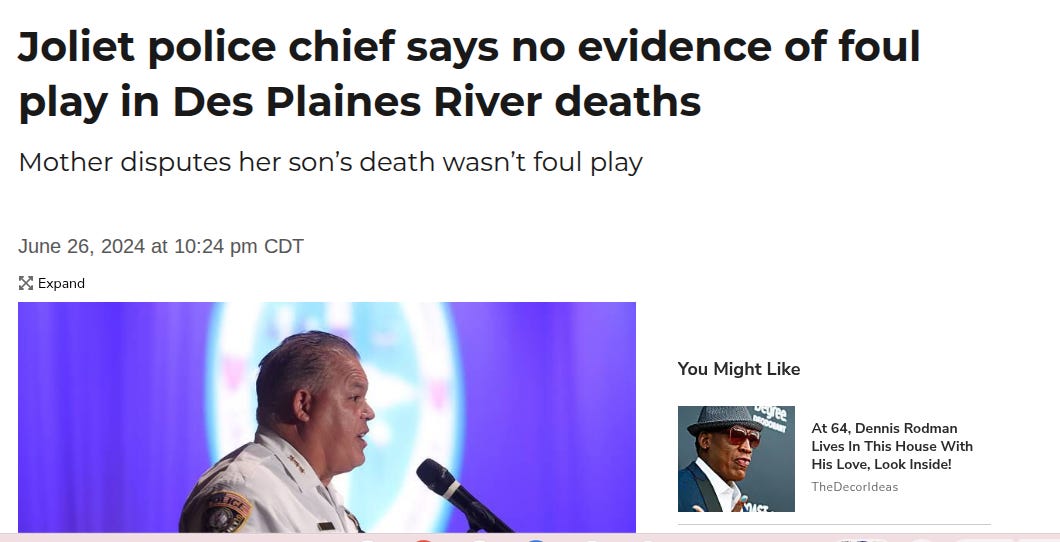 Coroner Summers’ office and Joliet PD have alternated between claiming Anthony’s death was a leap into the Des Plaines River, a drowning, or a drug overdose, with drowning not considered a cause of death.