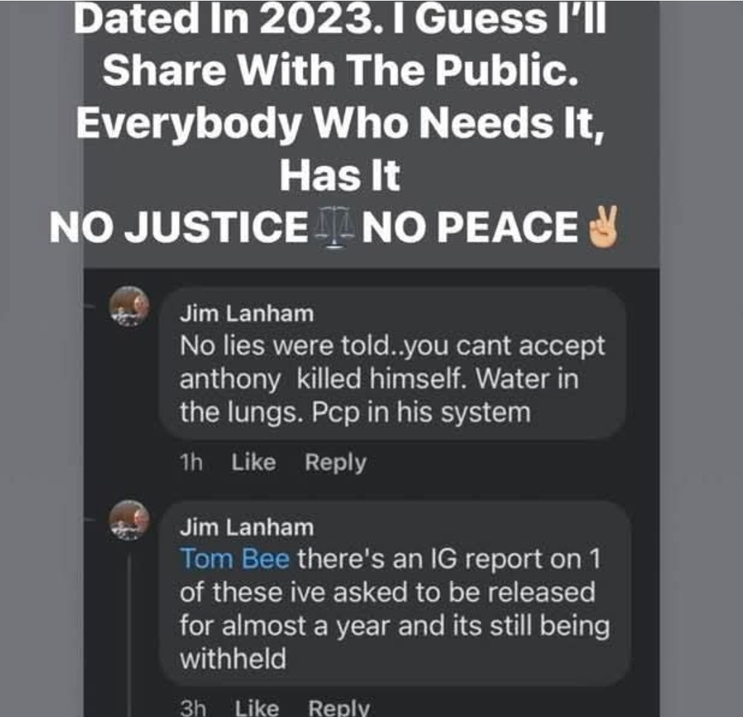Facebook/ One messages of Lanham either admitting to be one of the last people to see Anthony Dunn, admitting to knowing key details of his case, and or defending Coroner Laurie Summer's findings.
