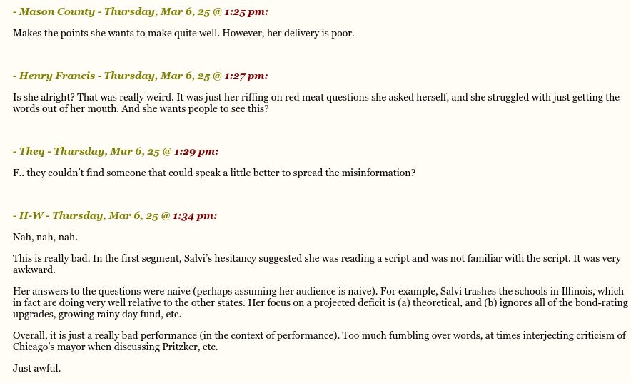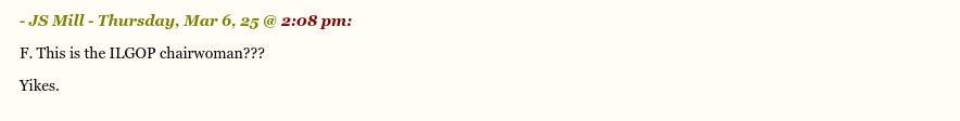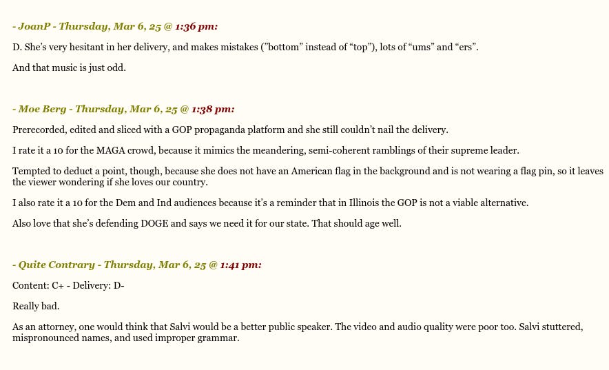 Then there’s ILGOP Chair Kathy Salvi, whose own “Nero fiddling while Rome burns” moment came as she appeared on Fox News on election day incoherently grandstanding while the party collapsed around her. Illinois Record has long documented concerns about Salvi’s inability to articulate a coherent message, and now that perception has extended beyond political insiders and into the general public.