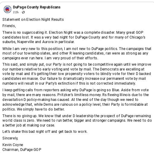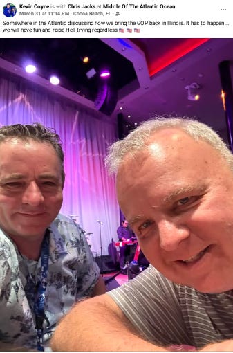 Even DuPage County GOP Chair Kevin Coyne admitted as much, publicly agreeing with our assessment. But rather than offer an apology or any self-reflection after overseeing an abysmal 0-41 record, Coyne was off enjoying a cruise while his party burned.
