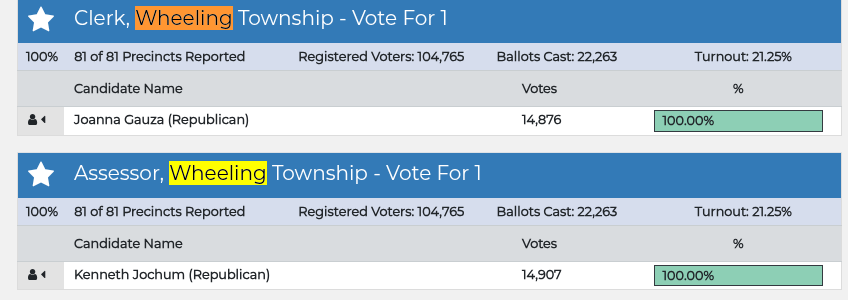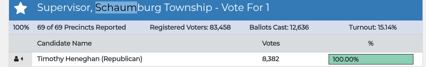 Over in Wheeling Township, Illinois Record previously reported that Chair Kathy Penner—who had run unopposed before—would face a challenger if she failed to block Republican Michelle Hunter from appearing on the trustee ballot. Sure enough, Penner had competition and lost her $38,000 township gig. But for some reason, Democrats had no issue letting her fellow "Republicans" Ken Joachum and Joanna Gauza slide through unopposed.
