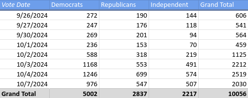 Notably, October 3 and 4 witnessed significant get-out-the-vote efforts from Democrats, with over 1,000 votes recorded each day.