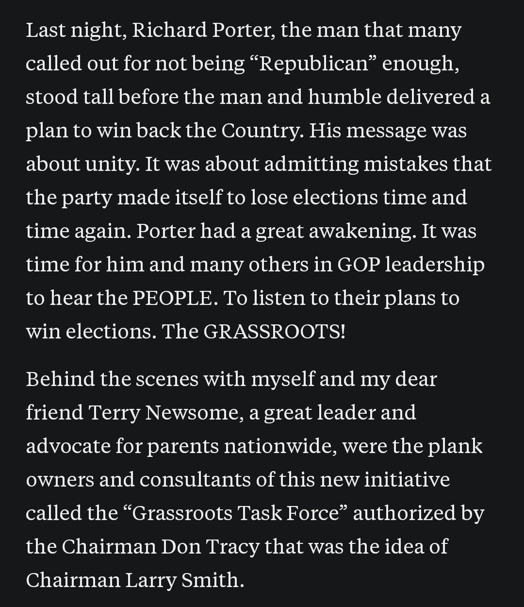 A year ago, we covered RNC committee chair Richard Porter’s role in creating the “grassroots committee,” with only a brief mention of Larry Smith. The Illinois Record respected Porter’s experience with the Clinton impeachment trial, his legal background, and his work at Kirkland & Ellis. It was surprising to see Porter support people like Val “stolen valor” Ojeda and self-proclaimed Latin King human trafficker Terry Newsome through the grassroots committee.