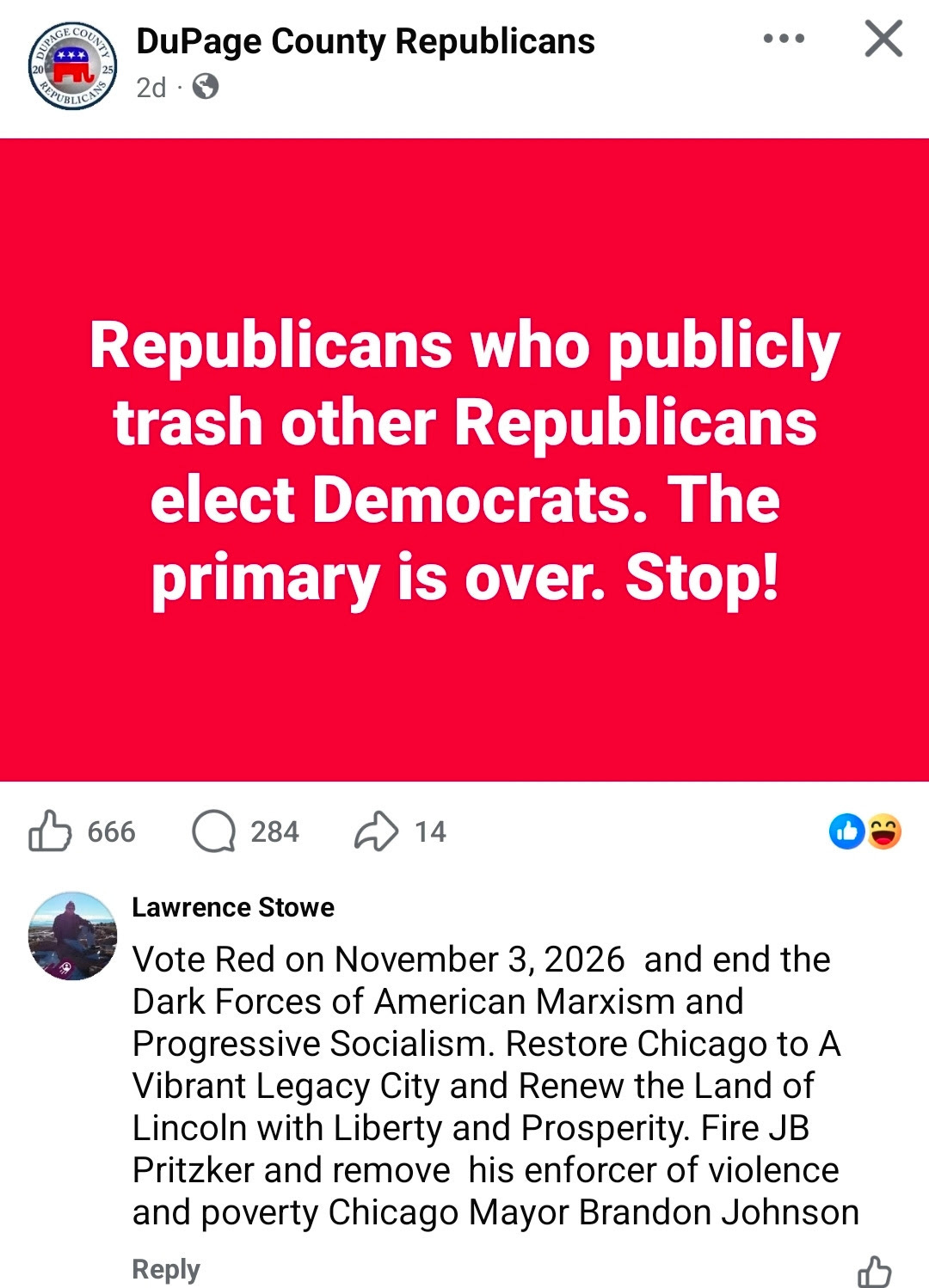 Reeves says candidates should “reset” after the primary. DuPage County GOP Chair Kevin Coyne adds that when Republicans attack each other, it helps Democrats win. Both leaders, despite criticism, know how to survive in a divided Illinois Republican Party.