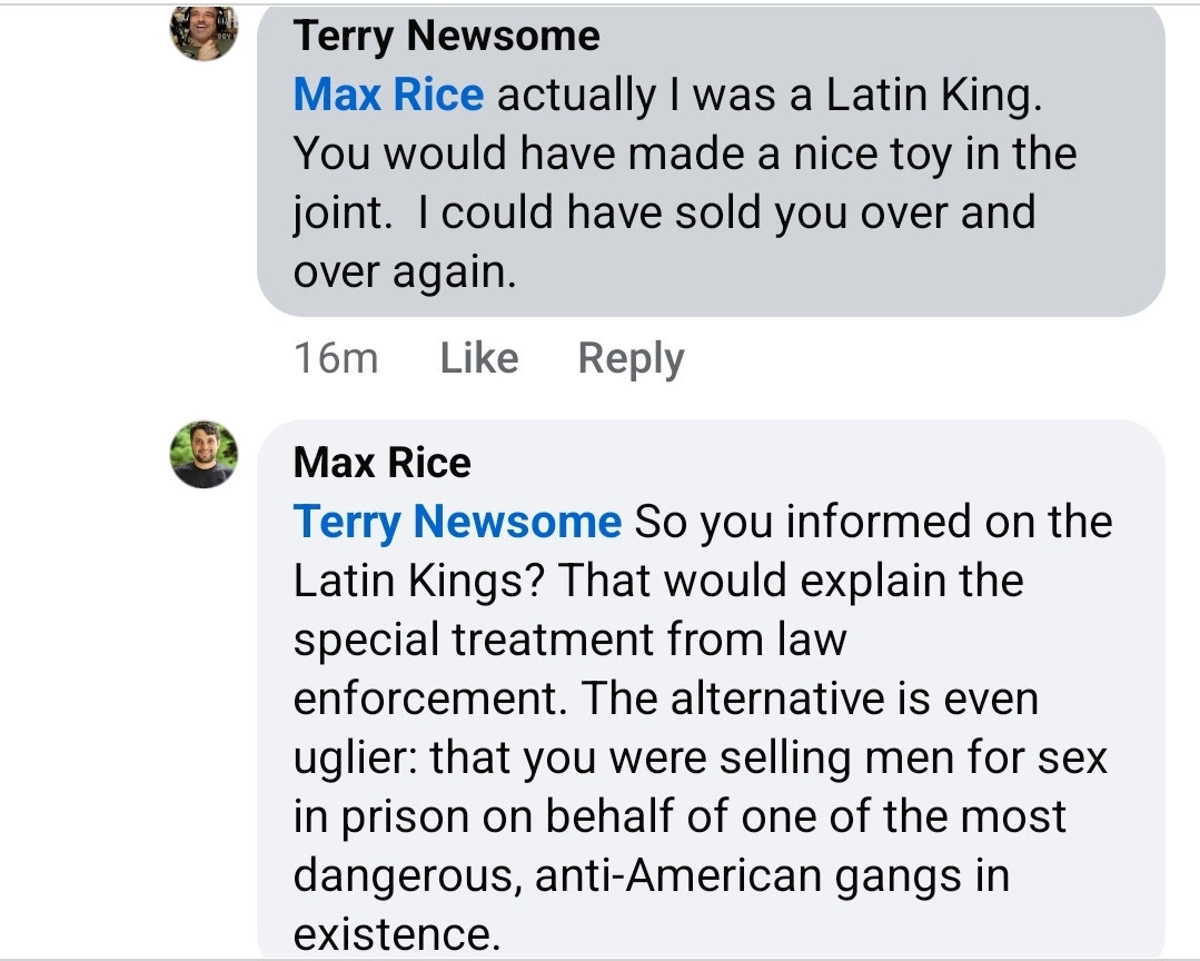 Facebook/ Terry Newsome who has been arrested for selling cocaine and explosives in the past claims on facebook to have been in the Latin Kings and could have sold the author in prison.